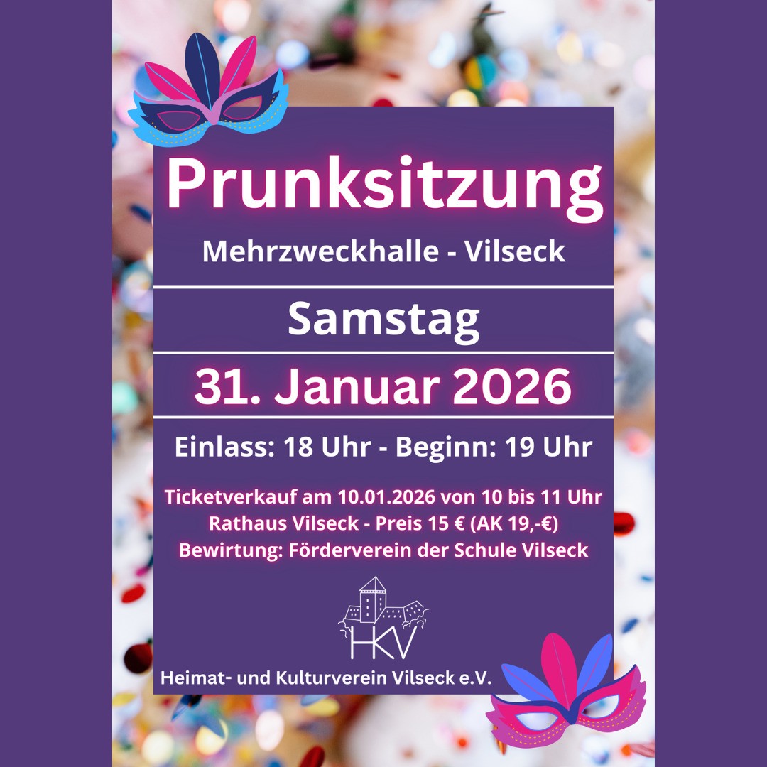 Zur beliebten Prunksitzung lädt der Heimat- und Kulturverein Vilseck am Samstag, 31. Januar 2026, in die Mehrzweckhalle der Grund- und Mittelschule Vilseck ein. Beginn der Veranstaltung ist um 19 Uhr, der Einlass erfolgt ab 18 Uhr.